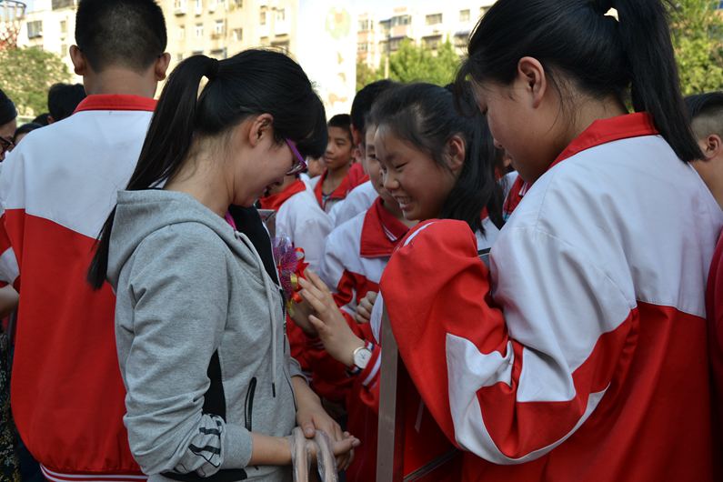 庄严的升国旗仪式拉开了整个活动的序幕,接下来初、高中部学生代表《感谢您,班主任老师》的主题演讲点燃了现场火热的激情,在一曲《感恩的心》悠扬动听的音乐声中,在全体学生热烈的掌声和欢呼声中,今天的“主角”班主任老师被同学们请到了队伍的最前面,各班班长给班主任佩戴上鲜艳的大红花;各班团支部书记给班主任围上漂亮的丝巾,送上代表全班同学情谊的心愿包;同学们也纷纷向班主任表达感激之情,他们用美丽的花束,恭敬的鞠躬、深情的拥抱向班主任传递爱的情谊,很多班主任老师感动得热泪盈眶,现场师生间汇集的师生情谊如阵阵暖流感染了整个会场。