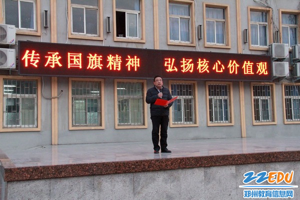 郑州103中党总支书记曾涛作国旗交接仪式主题讲话。曾涛说:“国旗卫队已成为我校升旗仪式上一道亮丽的风景,国旗交接仪式也成为了我校德育课程的传统内容。每年一度的国旗交接,全校师生在隆重的仪式中,感受并传承了一种责任和使命,那就是:像珍爱生命一样珍爱国旗,用实际行动为国旗增光添彩。希望每一位青年教师、青年学生在传承精神、履行职责中历练人生,让国旗精神永驻校园,让自己的青春年华绽放出更绚丽的色彩!