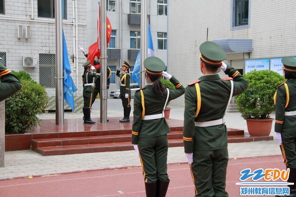 7:10,学校国旗护卫队踏着整齐的步伐护卫国旗入场。伴随着庄严的国歌,鲜艳的五星红旗冉冉升起,全体人员行注目礼、齐唱国歌。