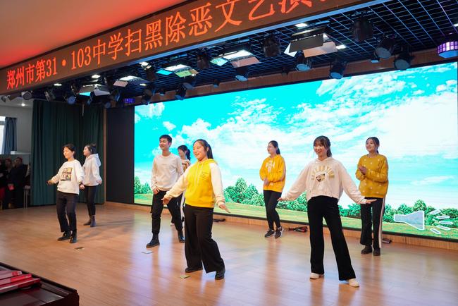 在现场的掌声与欢呼声中, 由各年级组、各处室精心准备的精彩演出轮番登场,七年级年级组带来的劲歌热舞《教师disco》青春洋溢,活力十足;高二年级组小品《师生一台戏》将师生校园中的酸甜苦辣演绎得淋漓尽致;而高二年级组的小品《武林课堂》则为现场观众带来了一堂奇幻无比,脑洞大开的“新时代教学手段下的武术修炼指南”;总务处带来的杯子舞别出心裁惊艳全场,诗朗诵《将进酒》潇洒快意,学生代表古筝连弹《我和我的祖国》悠扬动人,办公室、政教处的诗朗诵《可爱的祖国》《大写的中国人》寄托着学校师生对祖国的无限热爱,教师瑜伽社的精彩展示让晚会现场掌声不断,高三年级组自编自谱的原创歌曲《写给高三的歌》结合诗朗诵,将发生在郑州31·103中的美丽故事,倾心诉说,也把晚会现场的氛围带到了高潮。