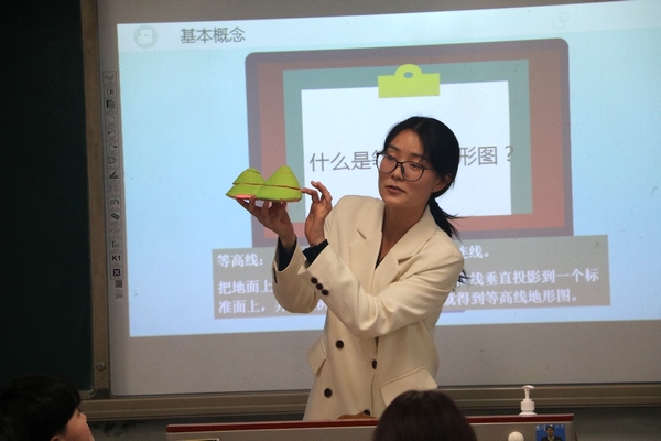 本次研讨活动分为两个阶段。第一阶段由李紫蕊老师进行课堂教学展示,课题是《等高线地形图》。本节课从课程类型上属于复习课,但是对大部分学生来说,和新课难度一样,学生学习最大的问题是构建高低起伏的地形和平面地图之间的内在联系,化抽象为具体。因此,李紫蕊老师在课前组织学生参观郑州市第三十一高级中学校内的“地理园”,观看等高线模型,认识基本地形。课堂上,李紫蕊老师又通过指导学生制作等高线模型,加深学生对等高线地形图的认识;指导学生分组利用模型手绘等高线地形图,归纳等高线特点,判读地形,并应用理论进行简单计算。
