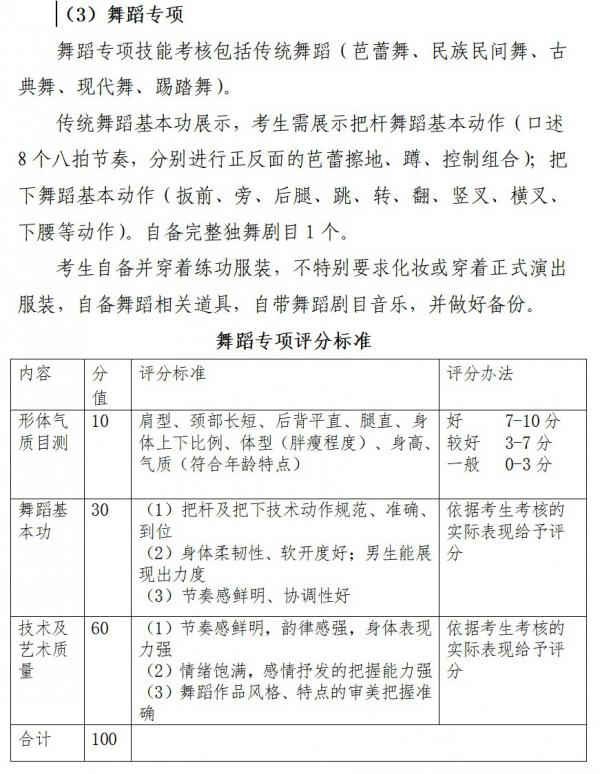 1.音乐:分为技能考核和素质考核两个部分,技能考核声乐、器乐、舞蹈三选一;素质考核简谱和五线谱的视唱,考核方式为根据专业水平进行抽查。