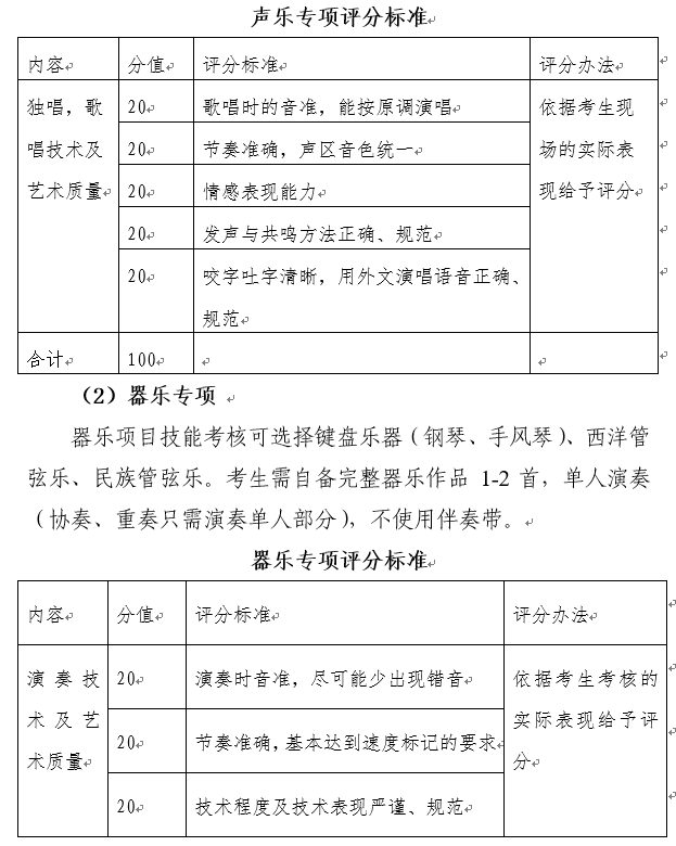 音乐主要考查考生在艺术审美体验中对专业技能的掌握程度和规范性。注重考生具有健康的审美情趣,舞台表演大方、质朴、不矫揉造作,表演时的完整性与流畅性,艺术表达准确,有艺术表现力和创造性的艺术思维。评分方法与标准参见如下: