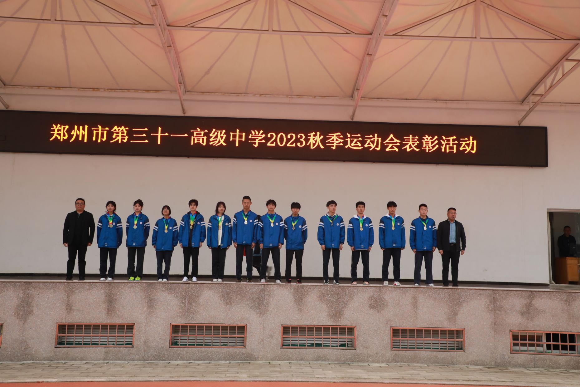 郑州市第三十一高级中学体育教研组长李永健老师宣布2023年秋季运动会各类奖项表彰名单。获奖学生依次上台,校领导为获奖学生和获奖班级颁发奖牌与奖状。