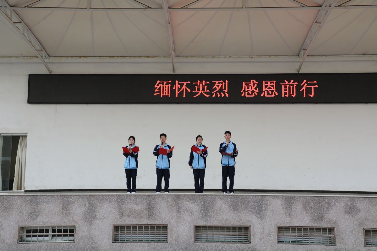 随后,周涵笑、吴鹏铠、张静萱、苗源育四位同学上台朗诵诗歌《清明祭英烈》,表达对革命先烈的缅怀之情。