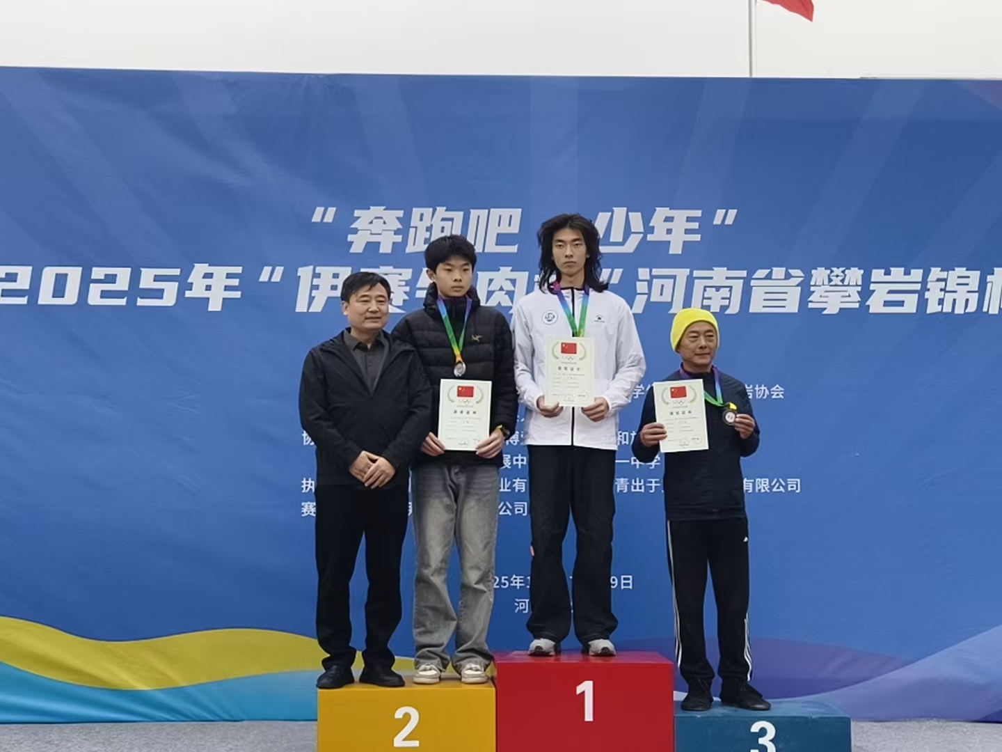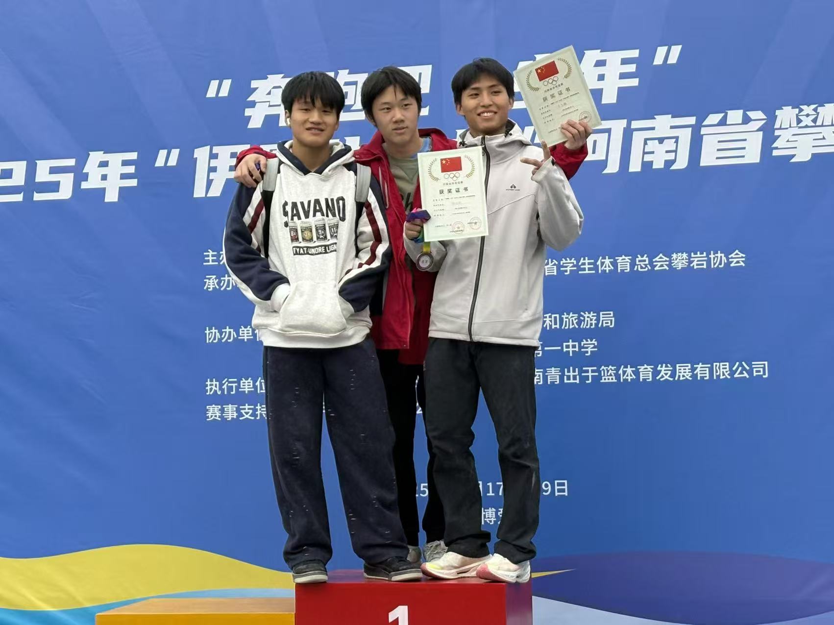10月19日,2025年河南省攀岩锦标赛圆满落幕,我校喜获佳绩,王飞越荣获甲组男子速度赛第一名、甲组男子攀石赛第三名,张亿龙荣获甲组男子速度赛第三名,姜程耀荣获公开组男子攀石第二名。