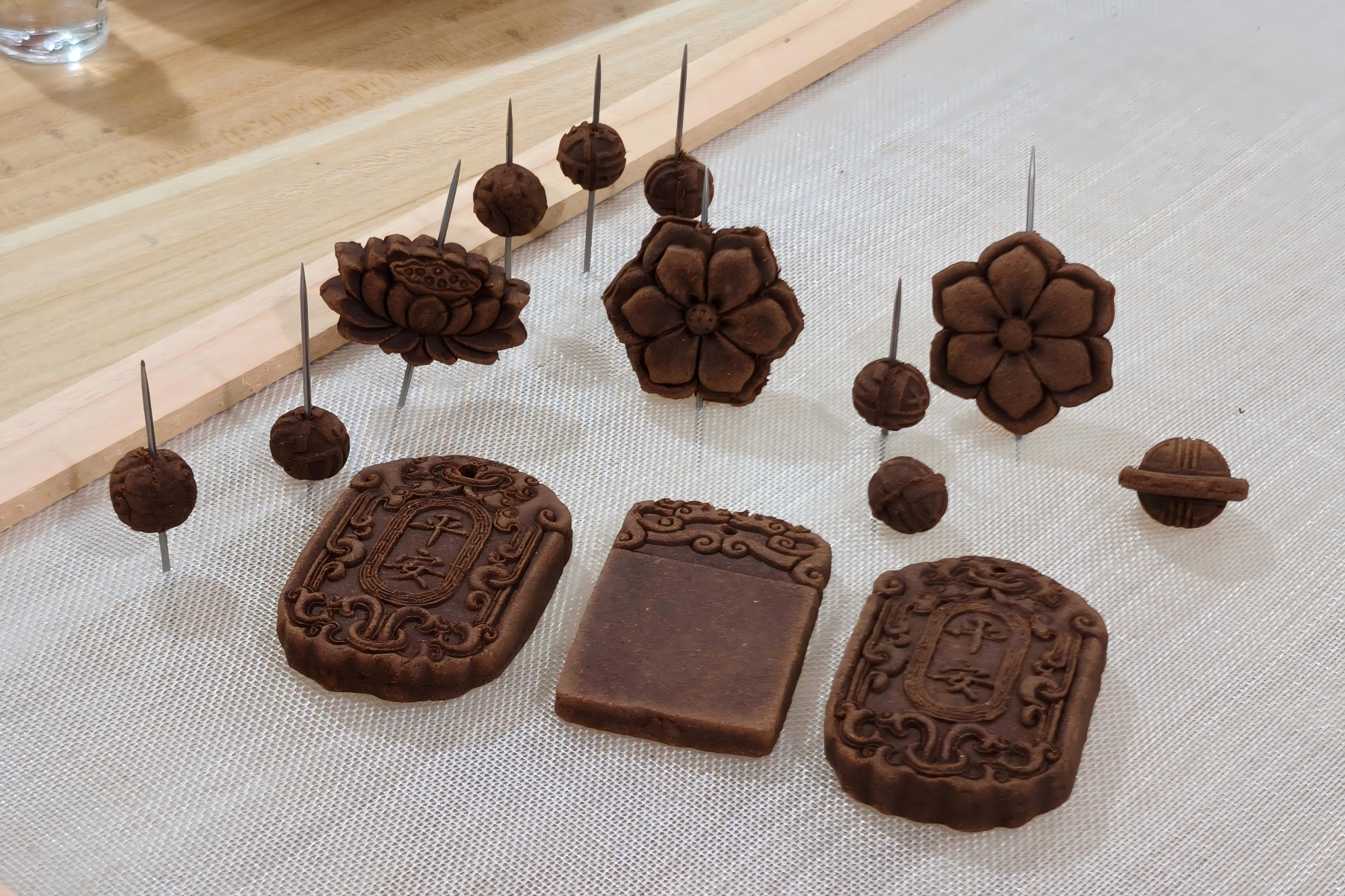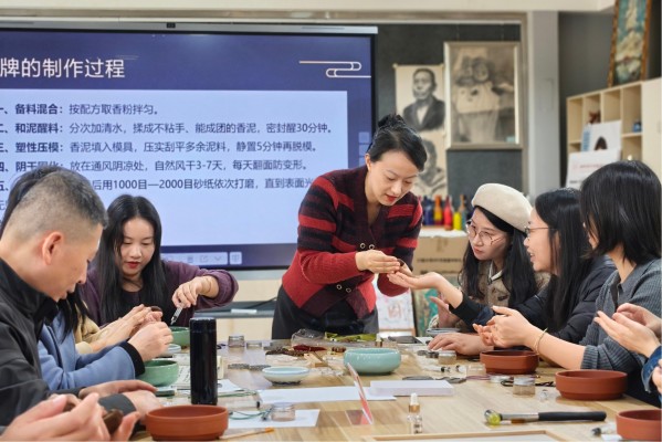 老师们积极学习、体验。和泥醒料时,老师们反复揉搓香泥至不粘手成团,静置30分钟体会“慢工出细活”;塑性压模环节,工作室瞬间变身“创意工坊”。双鱼、金锁、如意纹、醒狮等寓意美好的模具登场,大家填泥压实、静置脱模,每一个步骤都小心翼翼。脱模后的香牌雏形初现,带着草木的天然气息。老师们又细致修整,指尖摩挲间满是对古法的敬畏。未完成的香牌带着草木清香,静待阴干打磨,让老师们在馨香中沉淀心境。