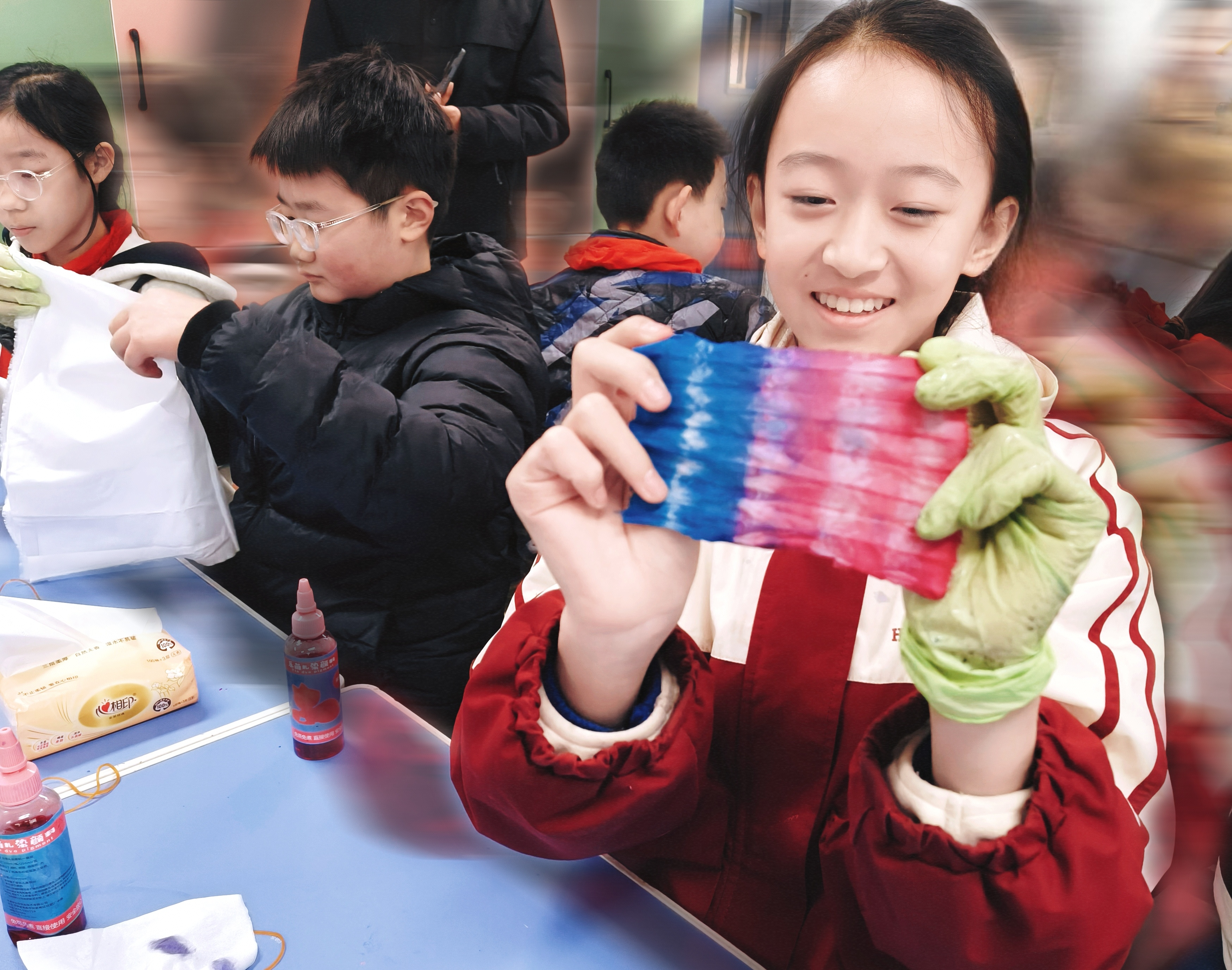 课堂的热情,远远超出了预期。平日里略显羞涩的孩子们,被五彩颜料和素白棉布牢牢吸引,全程目不转睛、踊跃互动。指尖翻飞间,普通的白布在绳结与夹子的塑造下,渐渐酝酿出独特的纹理。当孩子们小心翼翼地解开绳结,斑斓交织的美丽图案在眼前绽放时,教室里的欢呼声响成一片。不同的捆扎方法,造就了一件件独一无二的扎染作品,每一件都承载着孩子们的创意与期待。