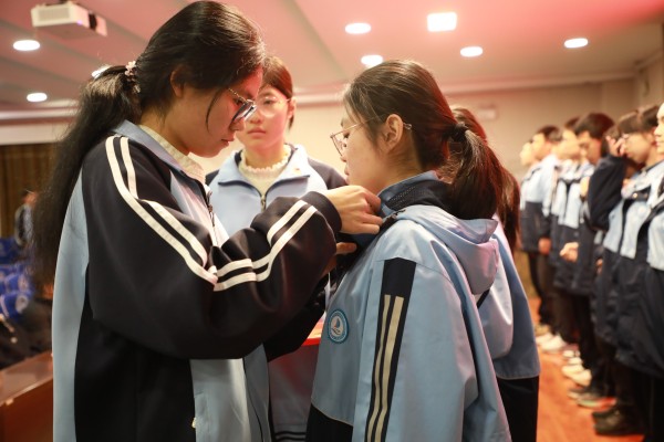 老团员为新团员佩戴团徽