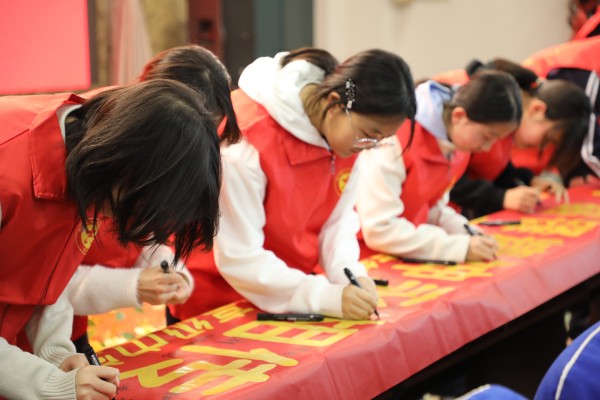 随后,全体志愿者进行学雷锋志愿服务主题宣誓,表达传承雷锋精神、积极开展志愿服务的坚定决心。志愿者学生代表还依次在写有“青春筑梦新时代,雷锋精神永相传”主题的横幅上签名承诺,表明参加志愿的赤诚之心。