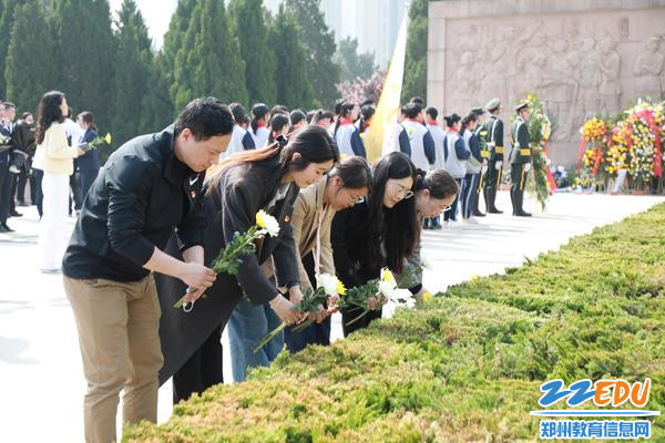 革命先烈纪念碑前,老师们向先烈敬献鲜花